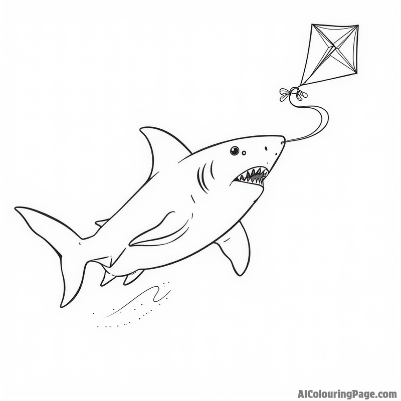 A black and white illustration of a shark with a kite caught in its teeth. The shark is facing the viewer with its mouth open and teeth bared. The kite is above the shark and attached to a string that the shark is holding in its mouth. The shark's body is long and streamlined, with a large dorsal fin and a caudal fin. The kite is a simple diamond shape with a tail. The illustration has a simple, cartoonish style, and the lines are thick and bold. The image is suitable for coloring or painting.