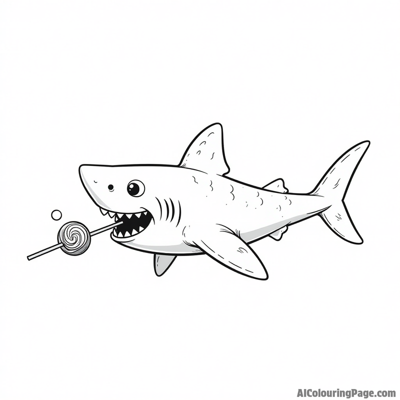 A black and white illustration of a shark. The shark has a lollipop in its mouth and is smiling. The shark is swimming in the ocean. The illustration is simple and childlike. It would be easy for a child to color or paint.