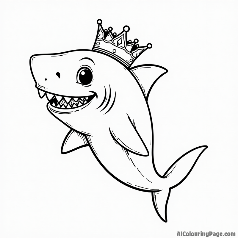 A hand-drawn illustration of a cheerful shark wearing a crown. The shark has a toothy grin and is surrounded by a white background. The illustration is a perfect coloring page for children or adults.