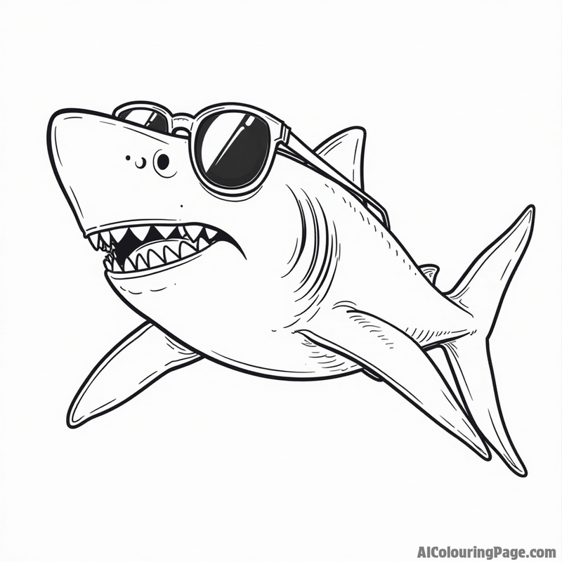A black and white illustration of a shark wearing sunglasses. The shark has its mouth open and is showing its teeth. It is swimming towards the viewer. The shark is the main focus of the image, and there is nothing else in the background. The image is simple and easy to understand, and it would be fun to color or paint.